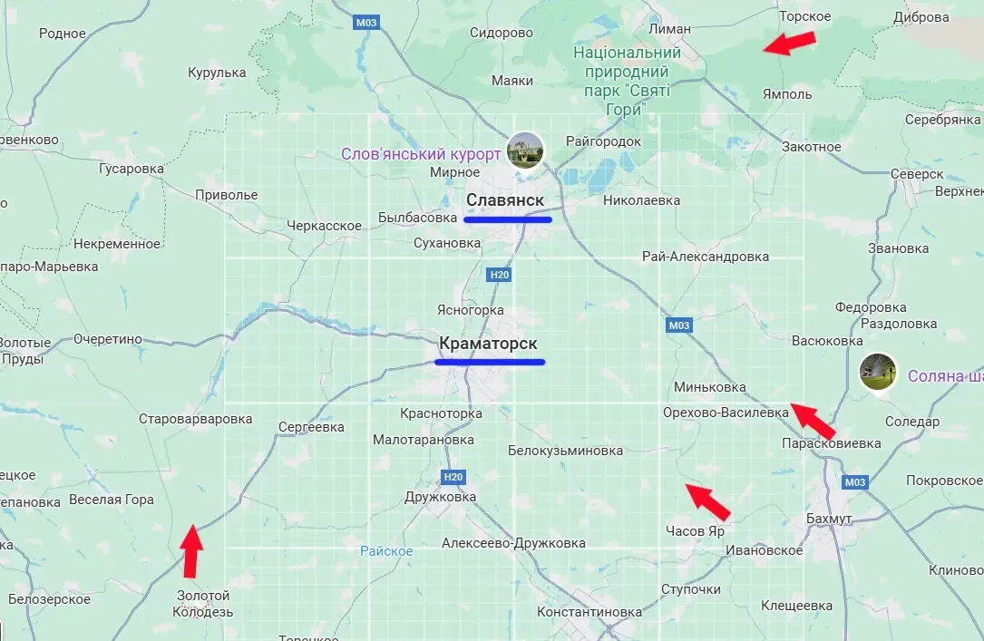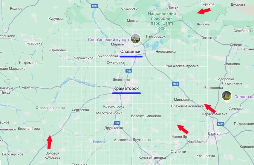На данный момент от передовых позиций армии России до юго-западной окраины Краматорска - 24 км. Примерно столько же от позиций к северу от Артёмовска, и менее 18 км от позиций к северу от Часова Яра. Таким образом, можно констатировать, что Вооружённые силы России проводят охват Краматорска по сценарию охватов других городов Донбасса, оккупированных ВСУ.