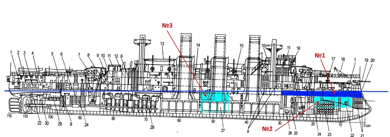 И, наконец, третий район затоплений – это вода, поступившая в угольные ямы «Осляби», расположенные по левому борту. Тут всё совершенно непонятно. Пожалуй, со стопроцентной точностью можно утверждать, что вода поступала в корпус «Осляби» вследствие японского попадания в район 10-й угольной ямы, и с этим никто спорить не будет. Но в какие отсеки и какое именно количество воды поступило в результате указанного повреждения – решительно неясно. Также можно лишь догадываться, был ли этот источник поступления воды в корпус корабля единственным. Так, уважаемый А. Рытик предположил, что помимо 10-й угольной ямы вода поступала также во 2-ю и 16-ю. Я так не считаю, но и моя точка зрения, и позиция А. Рытика – не более чем версии, строгих доказательств нет.