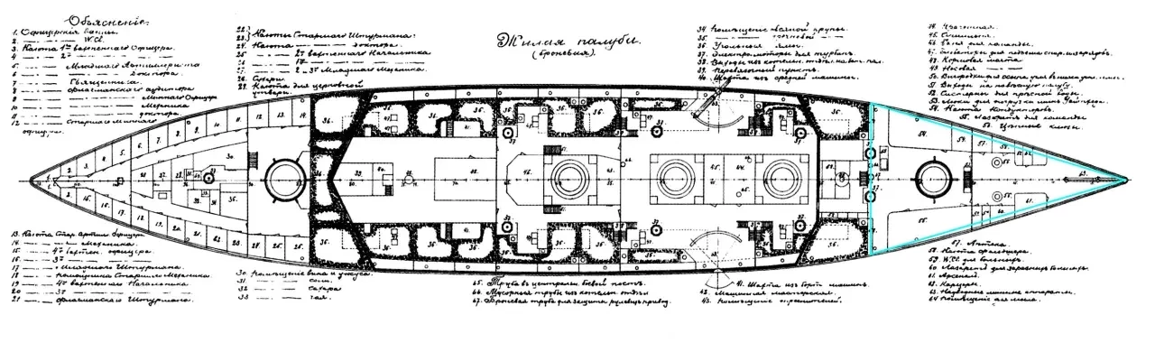 Расстояние между шпангоутами (длина шпации) составляло с 0-го по 18-й — 0,9 м, а начиная с 18-го, где у корабля начиналось двойное дно — 1,22 м. Соответственно, расстояние от 0-го до 30-го шпангоута состояло из 18 шпаций 0,9 м и 12 шпаций 1,22 м, а всего — 30,84 м. В районе 30-го шпангоута ширина броненосца составляла примерно 17,4 метра. По форме жилая палуба очень близка к прямоугольному треугольнику.