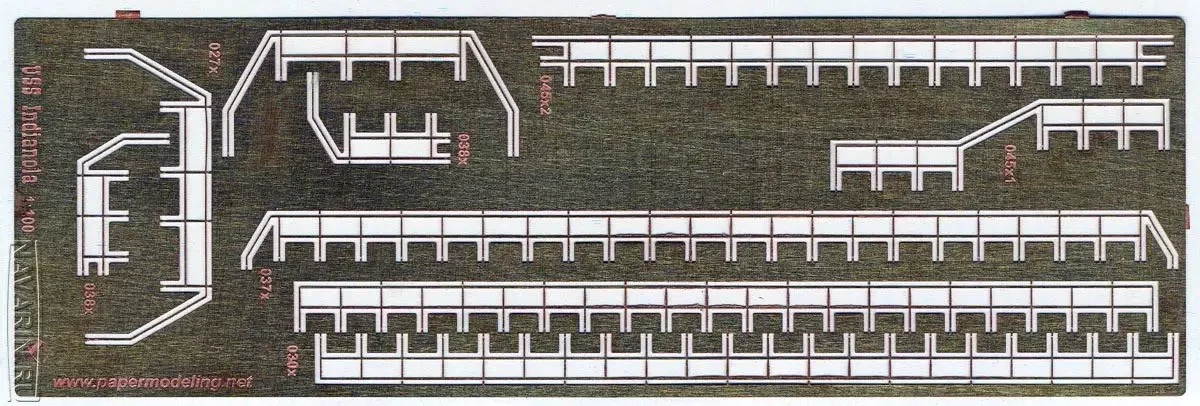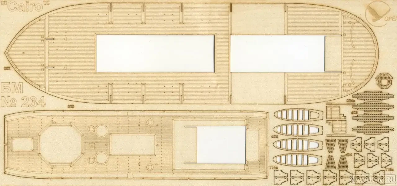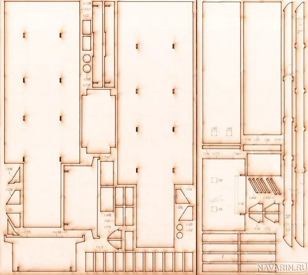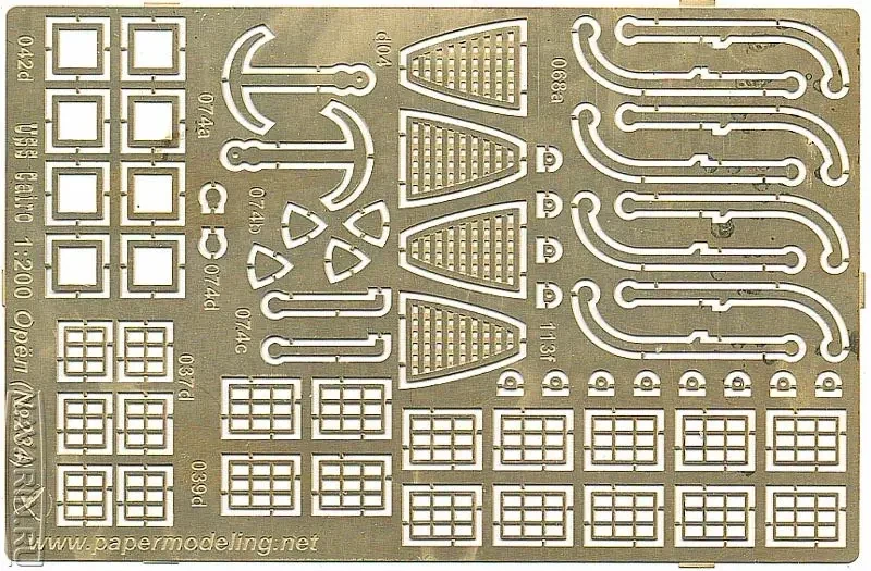 Таковыми, в принципе, были все бумажные модели прошлого века, разве что бумага на многих из них была довольно рыхлой. Зато сегодня такой бумаги в наборах уже нет. Мало того, появились производители, использующие современные технологии для изготовления дополнительных деталей бумажных моделей. Прежде всего, это комплекты лазерной резки. Обычно в этой технике делается «скелет судна» и его основные надстройки. Очень хорошо, что придумали еще и лазером не только вырезать детали моделей, но и гравировать палубы. Конечно, имея в руках бумажные палубы, вы всегда сможете наклеить на них «доски» из полосок шпона шириной 1,5–2 мм. Отдельные их неровности и шероховатости только лишь придадут вашей модели реализма, однако лазерная гравировка и очень красиво смотрится, и… экономит вам время на изготовление модели. Основной дополнительный материал для того же набора судна – шпангоуты и диаметральная плоскость – это картон: 0,5 мм, 1 мм и 1,5 мм. Добавляются к наборам сегодня и металлические детали «фототеч», полученные методом фототравления тонкого металла – обычно латуни.
