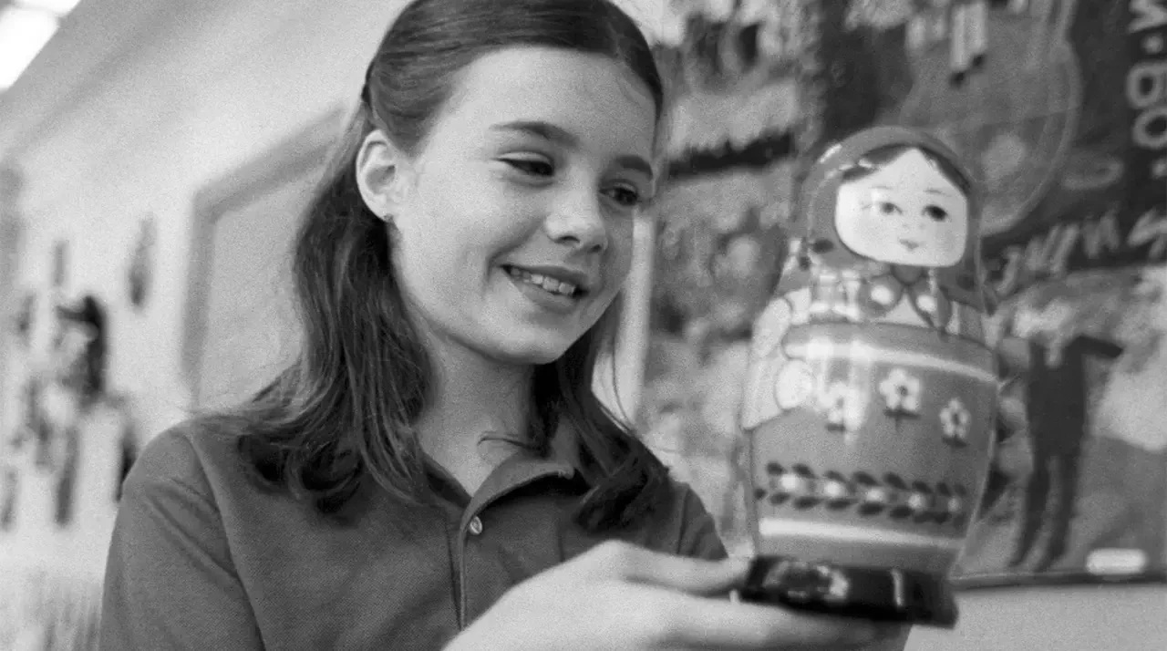 Саманта Смит с русской матрешкой — подарком музея игрушки в Сергиевом Посаде (Загорске), июль 1983 года