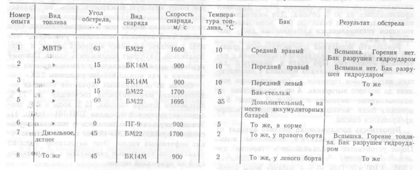 В отличие от обычного летнего дизельного топлива, которое без труда вспыхивало при попадании кумулятивных и подкалиберных снарядов, эмульсия показала исключительную стойкость к воспламенению. Баки с ней, как и положено, разрушались от гидроудара, но горения в ходе обстрела танка добиться не удалось. Только в ходе первого эксперимента (№1), когда стреляли подкалиберным снарядом в зону среднего правого бака, произошла вспышка, но тоже без дальнейшего горения.