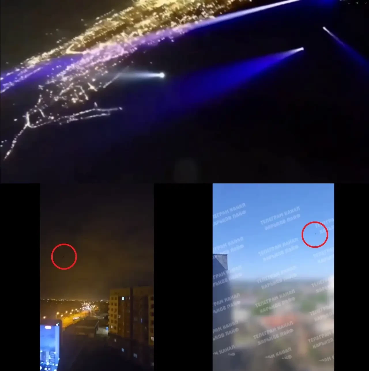Вид с камеры «Герани», летящей на большой высоте (вверху) и кадры пикирования «Гераней» с большой высоты