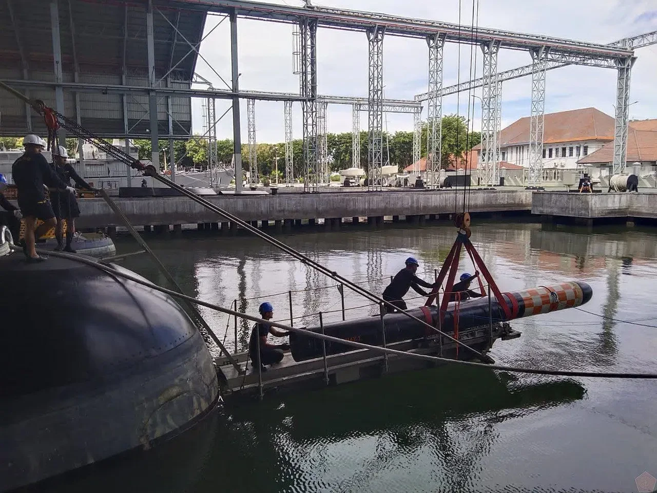 Погрузка итальянской тяжёлой торпеды Black Shark от «Финкантьери» на индонезийскую подлодку «Алугоро».
