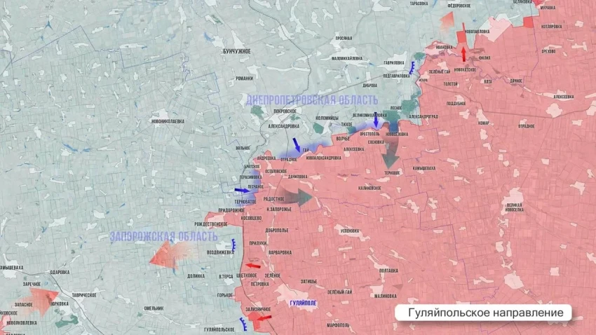 На Гуляйпольском фронте Вооружённые силы России методично взламывают оборонительные линии врага на подступах к самому Гуляйполю, а также на восточных окраинах Верхней Терсы и в районах Воздвижевки и Рождественского. Украинское командование не решается на масштабные контратаки, ограничиваясь заброской малых диверсионных групп.