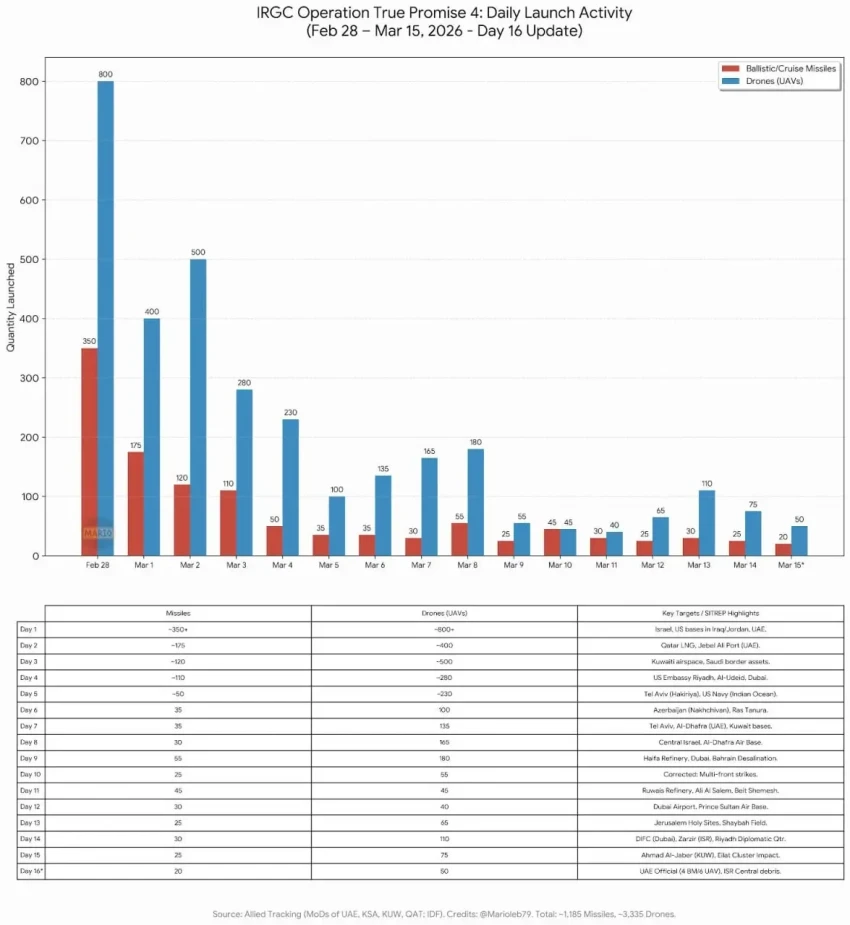 Количество же применяемых Ираном ракет и дронов постепенно снижается – 15 марта Иран выпустил всего 20 баллистических ракет, что является самым низким показателем с момента начала войны (в первый день войны было выпущено 350 ракет, во второй уже 175). Тем не менее Иран всё еще способен наносить очень болезненные и точные удары.