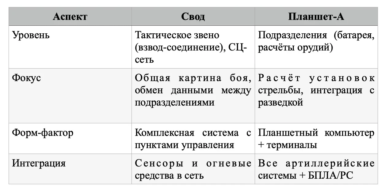 «Свод» — не отдельное физическое устройство, а программно-управляемая система, работающая на существующих военных компьютерах и планшетах типа «Планшет-А» или «Планшет-М-ИР» от Ростеха. К слову, комплекс «Планшет-А» может управлять стрельбой практически всех состоящих на вооружении артиллерийских систем и всей номенклатуры боеприпасов. Изделие адаптируется под любое артиллерийское подразделение, в том числе смешанного типа, и может взаимодействовать со средствами разведки. «Планшет-А» обеспечивает оперативное управление и ведение контрбатарейной борьбы, сводит к минимуму время от получения целеуказания до поражения объекта. Оборудование дает возможность применять перспективные средства связи и получать данные, в том числе видеопоток с БПЛА, непосредственно на рабочее место командира в режиме реального времени.