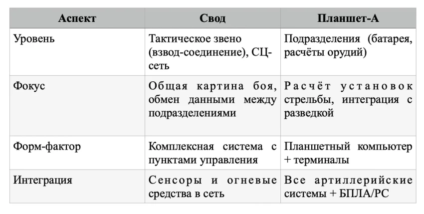 «Свод» — это не только артиллерийская система, это логичное продолжение более масштабного проекта ЕСУ ТЗ (единая система управления тактического звена), который разрабатывался с начала 2000-х годов концерном «Созвездие». Система изначально задумывалась как сетецентрическая архитектура, объединяющая разведку, артиллерию, средства ПВО, подразделения РЭБ, пехоту, инженерные и тыловые службы. В качестве примера сетецентрической архитектуры можно привести ГИС «Карта 2011» разработки КБ «Панорама», которая ещё в 2011 году осуществляла топогеодезическое обеспечение войск.