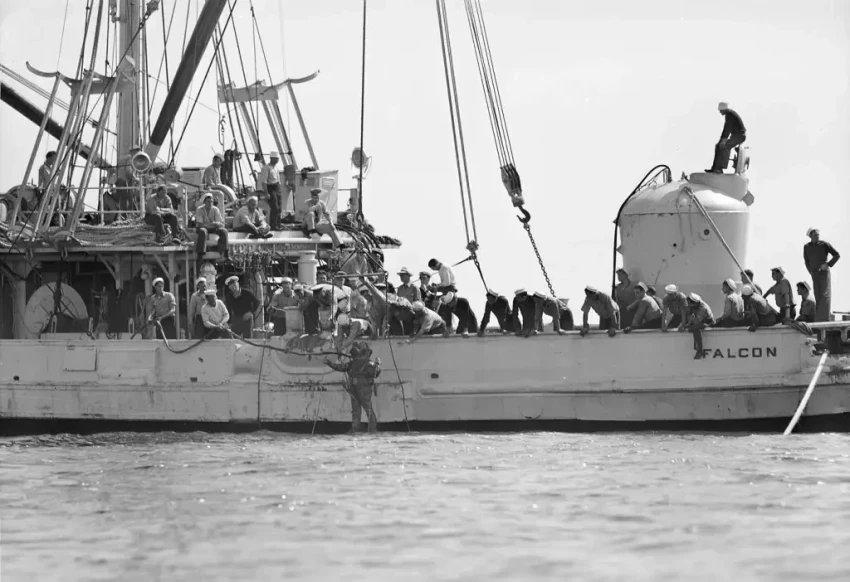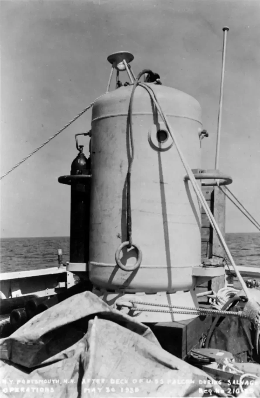 Спасательный колокол Маккенна на борту спасательного буксира «Falcon» в ходе спасения моряков с затонувшей SS-192 «Squalus»