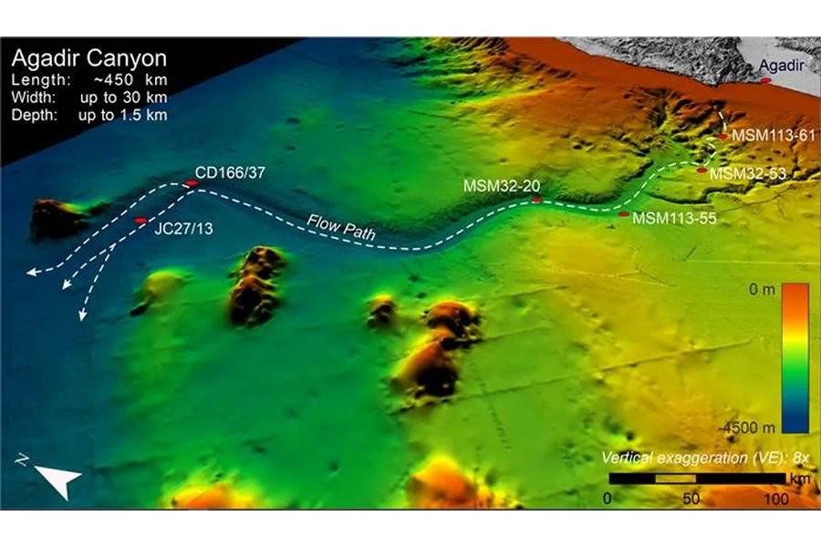Начав с объема всего в 1,5 кубических километра, он превратился в огромную и мощную лавину (или, скорее, в комок из гравия, песка и грязи), способную разрушить 400 километров одного из крупнейших подводных каньонов в мире — каньона Агадир, а также около 4500 квадратных километров стен каньона.