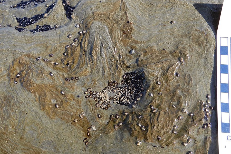 «Еще одна проблема с идентификацией этих следов заключается в том, что многие из них оказываются под водой дважды в течение 24-часового периода, когда наступает прилив», — говорит Мартин. «Всевозможные виды современной морской жизни, включая водоросли, трубчатых червей, усоногих рачков и моллюсков, покрылись коркой и частично размыли некоторые из следов».