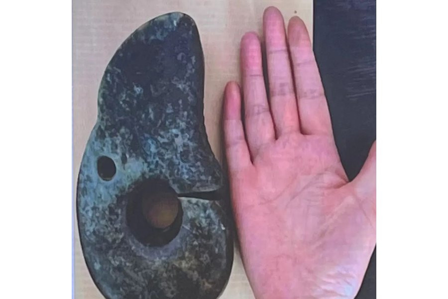 Артефакт размером 15,8 см в длину, 9,5 см в ширину и 3 см в толщину был найден на месте, где на севере находилась круглая гробница, а на юге — квадратный алтарь. Это единственный артефакт такого рода, когда-либо найденный в этом регионе.