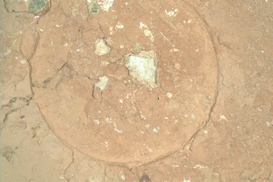 Чтобы получить изображения изнутри скалы, Perseverance сделал абразивный участок в скальном выступе под названием «Wallace Butte». Абразивный участок имел диаметр пять сантиметров, а большое зеленое пятно, которое можно увидеть в верхнем левом углу изображения, имеет диаметр около двух миллиметров. Изображение было получено на 1243-й марсианский день миссии Mars 2020.