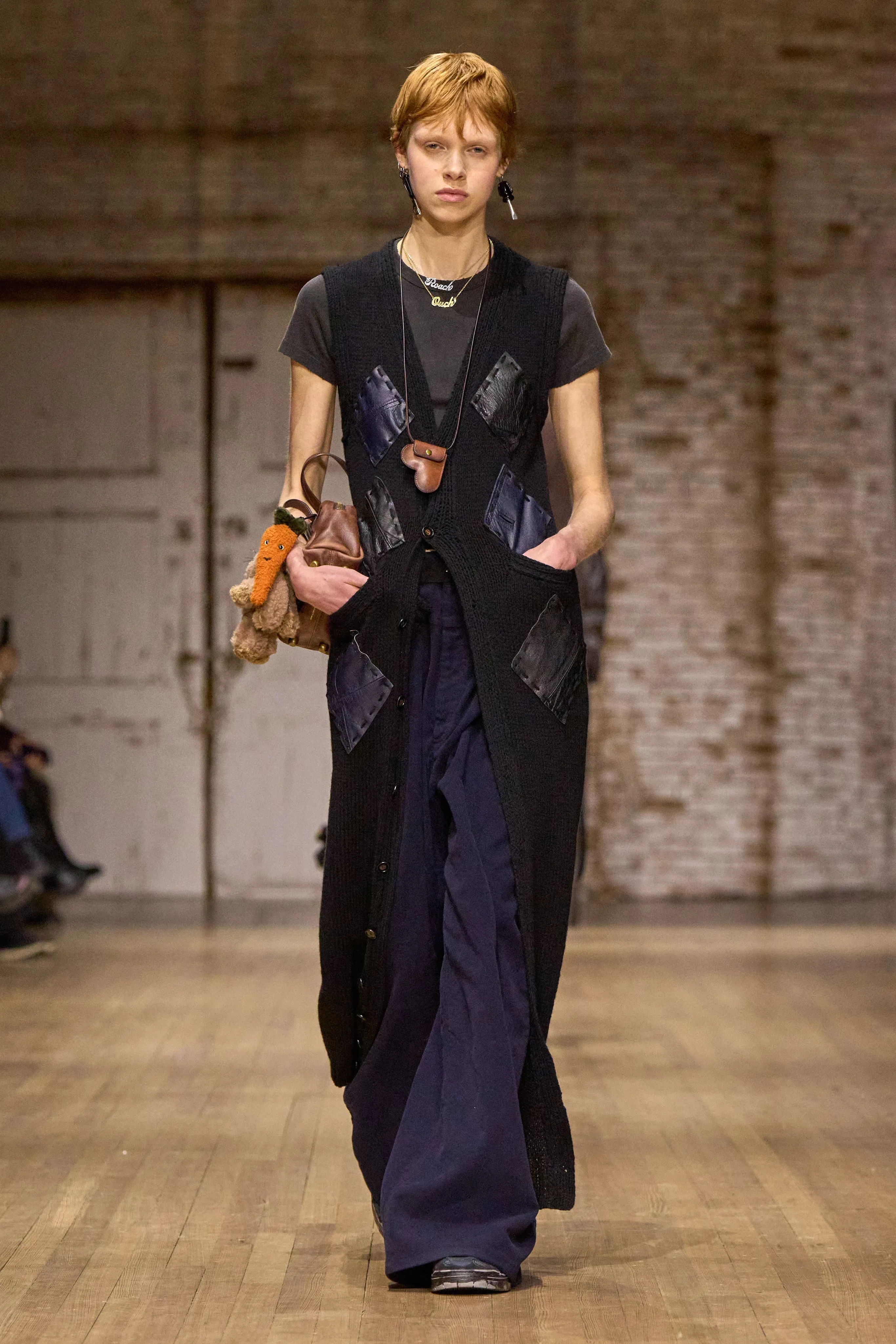 Леннон Галлахер/Фото: Dimitrios Kambouris/Getty ImagesНа подиуме преобладали вещи в уличном стиле расслабленного силуэта с отсылками к нулевым и детству: широкие брюки на низкой талии с тонкими ремнями, короткие косухи, длинные дублёнки, яркие очки в пластиковых оправах, плюшевая обувь, "разрисованные" футболки, жилетки с "заплатками", леопардовые шубы, сумки-медальоны и брелоки в виде игрушек. В прошлом году бренд оказался в списке самых успешных в рейтинге Lyst и стремительно набирает популярность среди зумеров.