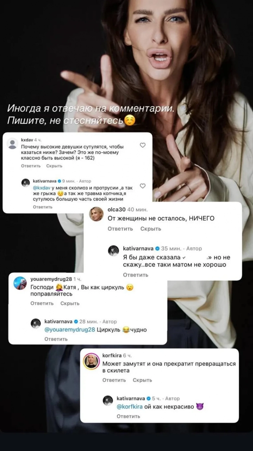 Екатерина Варнава/Фото: скриншот видео/Instagram*Варнава не только ответила на замечания, но и опубликовала скриншоты комментариев с подписью: "Иногда я отвечаю на комментарии. Пишите, не стесняйтесь". На комментарии Варнава отвечала с юмором, например перечислила свои болезни: "У меня сколиоз и протрузии, а также грыжа. А также травма копчика, а я сутулюсь большую часть своей жизни".