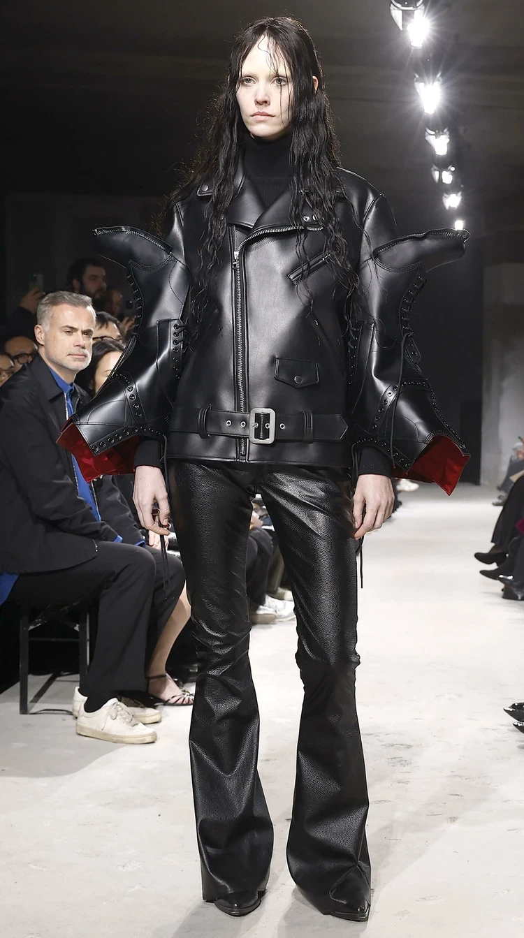 Еще один японский модельер Джуниа Ватанабе пофантазировал на тему оригами в одежде. Так, по подиуму прошлась модель в тренче, который, как будто выкроили методом оригами. Еще один запоминающийся образ — кожаная куртка с пришитыми к рукавам сапогами. Японские дизайнеры явно наступают на пятки Демне Гвасалии.