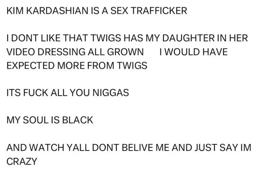 В новой серии постов Канье высказался о семье Кардашьян — Дженнер, назвав их "секс-торговцами". "Кардашьяны занимаются секс-торговлей темнокожими детьми, которых специально производят для этого", — написал Уэст в соцсети Х. Также он добавил, что ему не нравится, что его дочь Норт откровенно одета в новом клипе певицы FKA Twigs: "Мне не нравится, что в своём клипе Twigs переодевает мою дочь во взрослую одежду".
