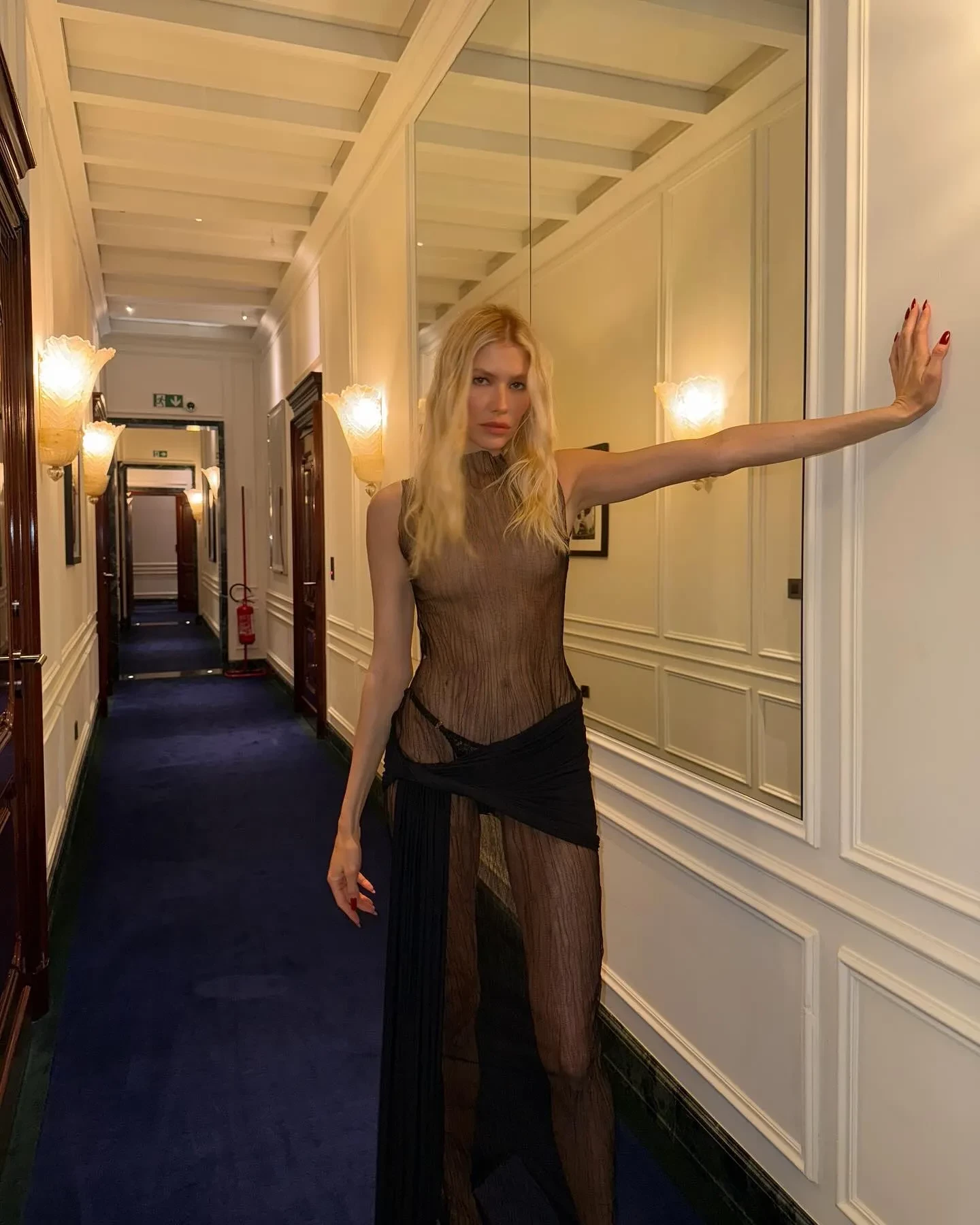 На снимках 38-летняя Перминова позирует в полупрозрачных платьях Francesco Murano и Walk of Shame, в корсете Ulyana Sergeenko, а также в автомобиле без макияжа. Кроме того, она добавила кадр из лифта с Тарасом, совместное фото с братом Демны Гвасалии Гурамом и топ-моделью Элтоном Мейсоном.