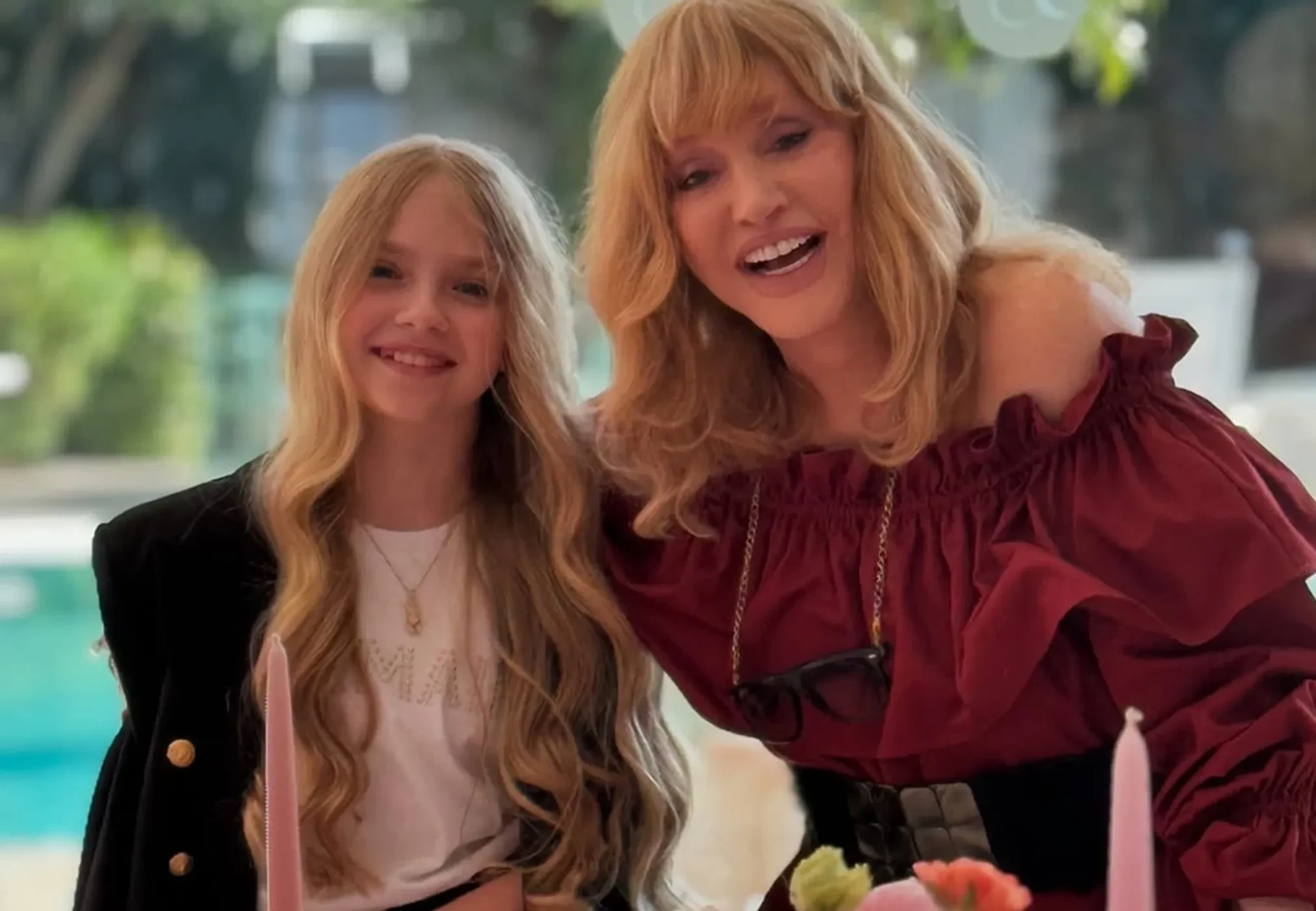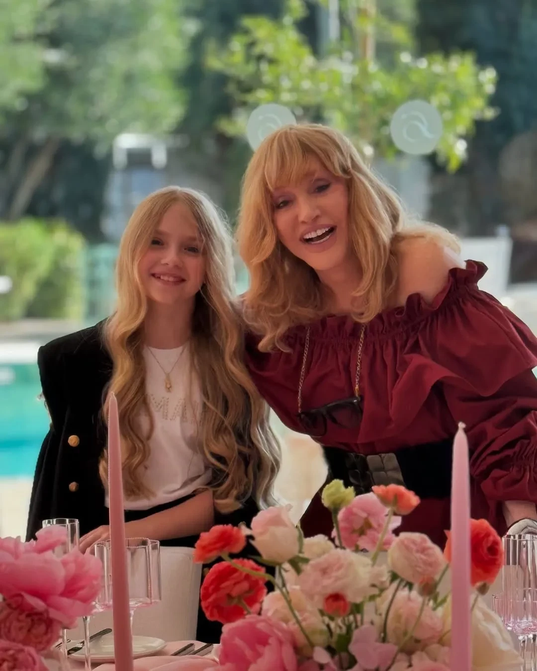 День рождения певица отмечала в мини-платье красного оттенка с широким ремнём на талии и открытыми плечами. Судя по фото, праздник прошёл на веранде дома семьи на Кипре, где, по данным СМИ, они сейчас живут. Торжество проходило у бассейна и было оформлено в розовых тонах: на столах, укрытых розовой скатертью, между букетами роз разных оттенков розового стояли бокалы и свечи в тон.
