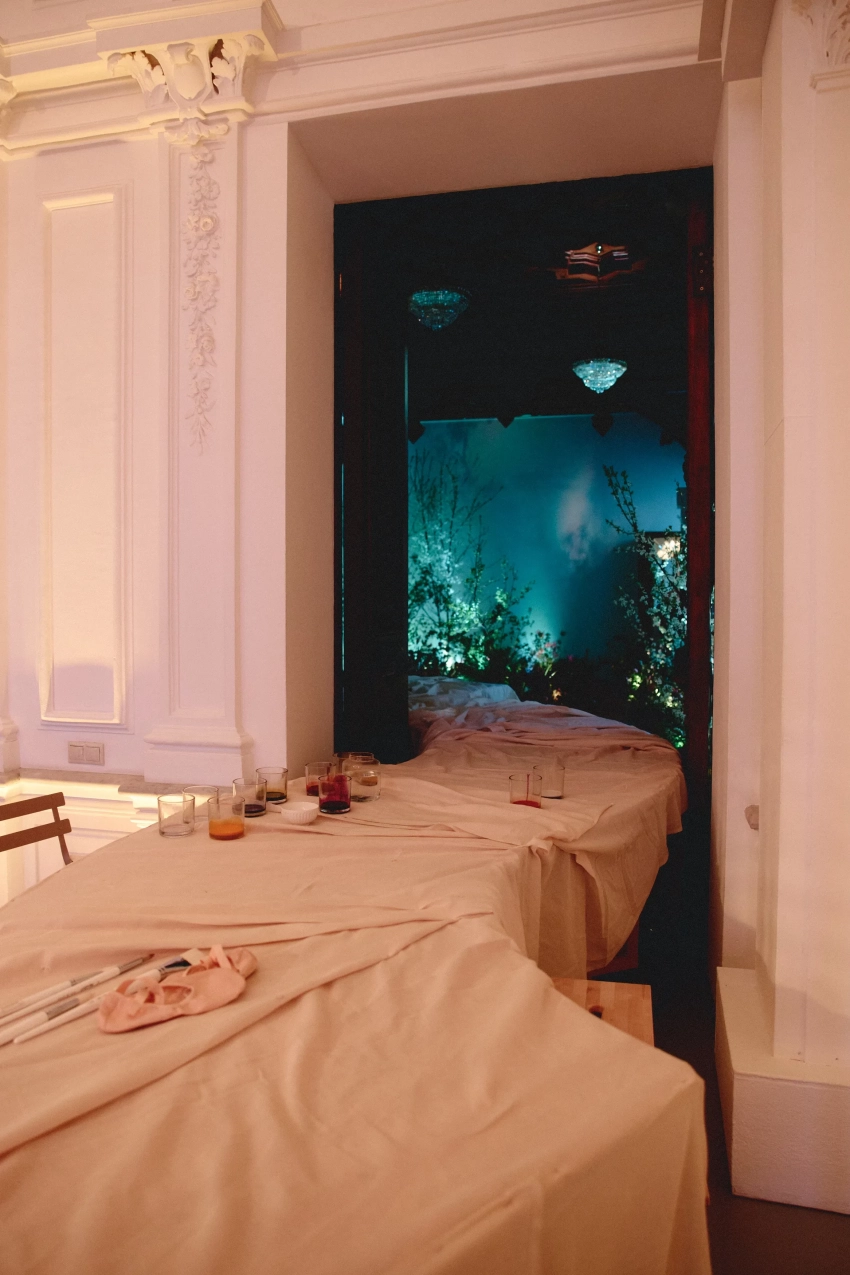 Нино НинидзеАлександр РоговЮлия БарановскаяАлексей СухаревЮлия БордовскихВиктория Манасир (слева)Диана МанасирЕкатерина Мухина и Андрей АртёмовДарья КлюкинаЗараЕлена КрыгинаВечер прошёл в атмосфере французского колорита: особняк превратился в цветущий сад с тематическими зонами. Модели дефилировали в зале, украшенном живыми цветами. Также гостям презентовали газеты, выпущенные специально к выходу коллекции, выступали академический хор и Арсен Гатциев и прошёл арт-перформанс.