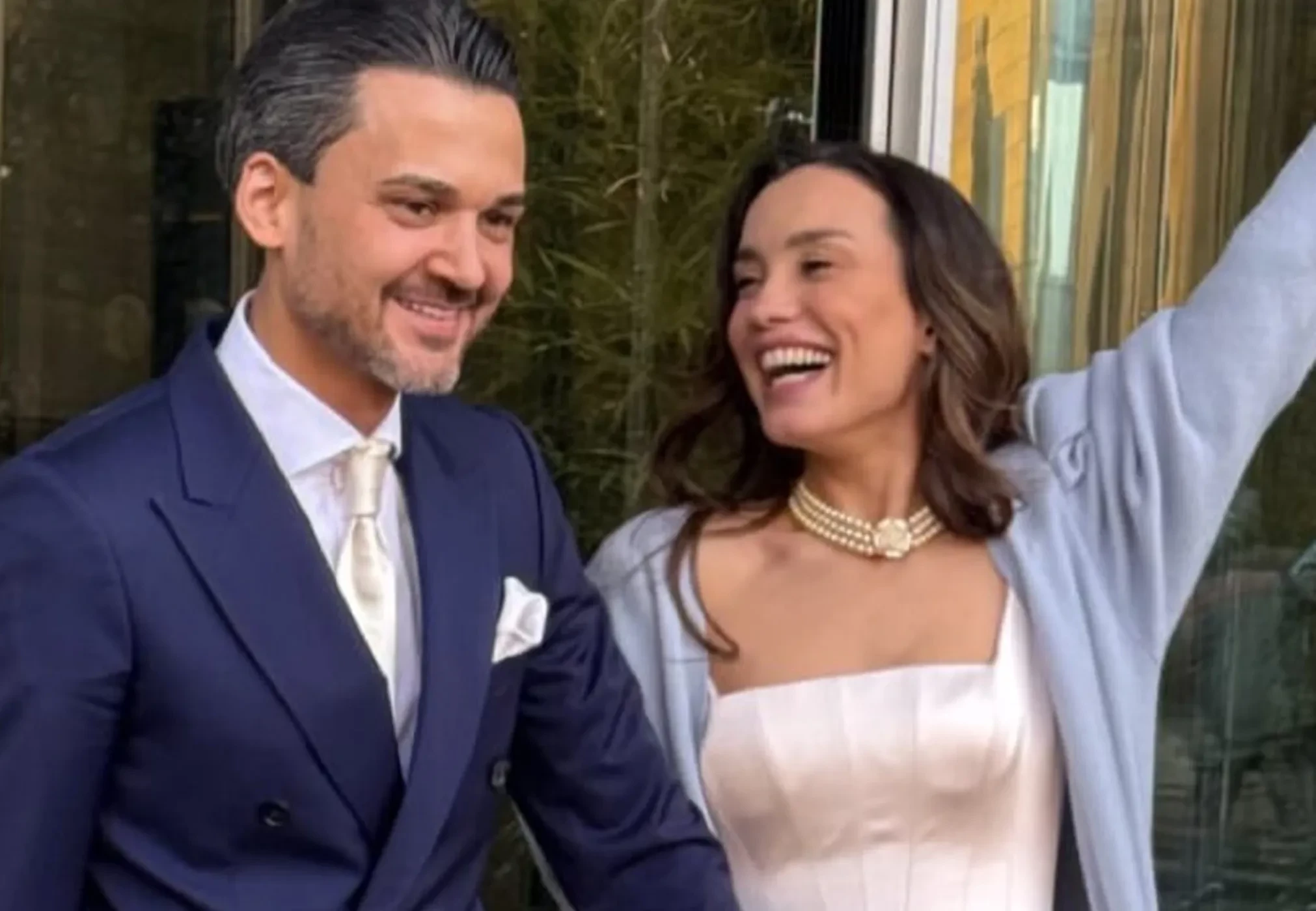 К гостям невеста вышла в белом атласном платье с корсетом, её волосы были распущены, а из аксессуаров на ней было жемчужное колье. На женихе был синий классический костюм. Для вечеринки после регистрации Дайнеко переоделась в более удобный наряд.