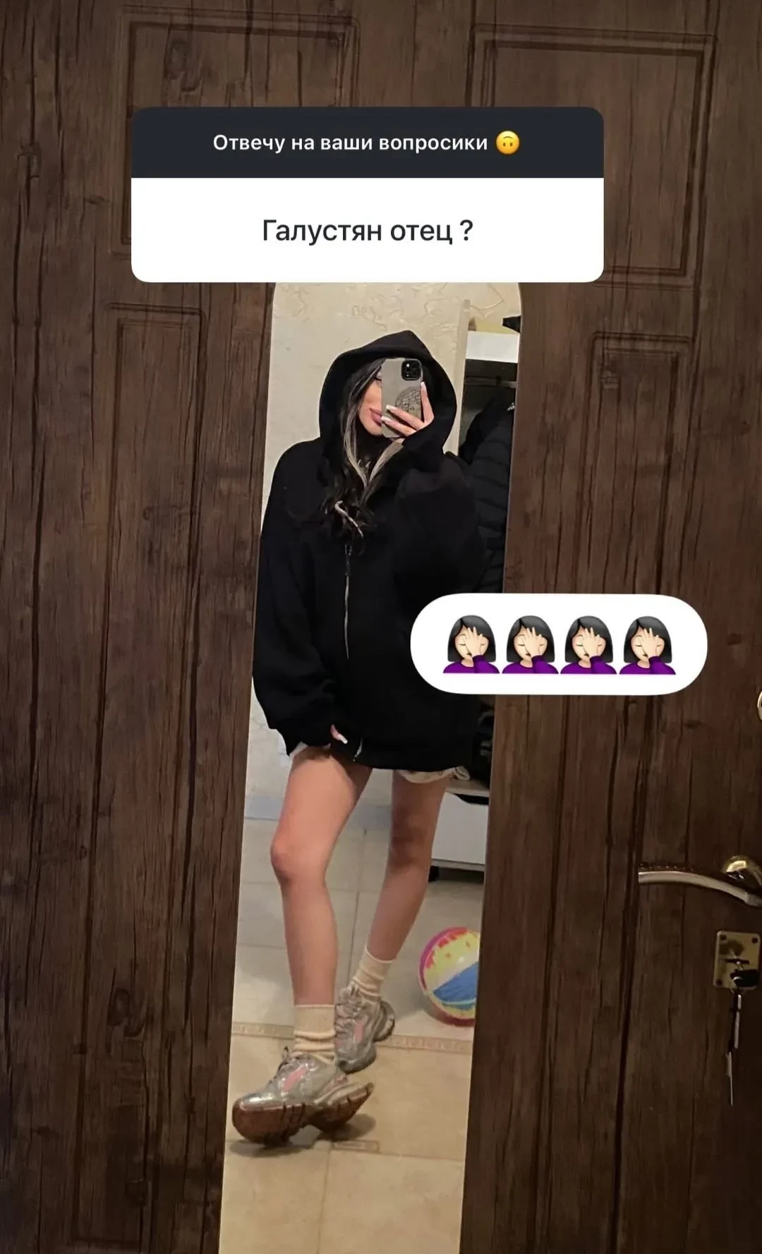 Скриншот инстаграма* МиленыСкриншот инстаграма* МиленыСкриншот инстаграма* МиленыСкриншот инстаграма* МиленыТакже она ответила на вопросы подписчиков. Визажистка рассказала, что у нее будет мальчик смешанных кровей. На вопрос о том, является ли все-таки Галустян отцом ребенка, она отреагировала лишь эмодзи в виде жеста, известного как фейспалм (рука, закрывающая лицо).