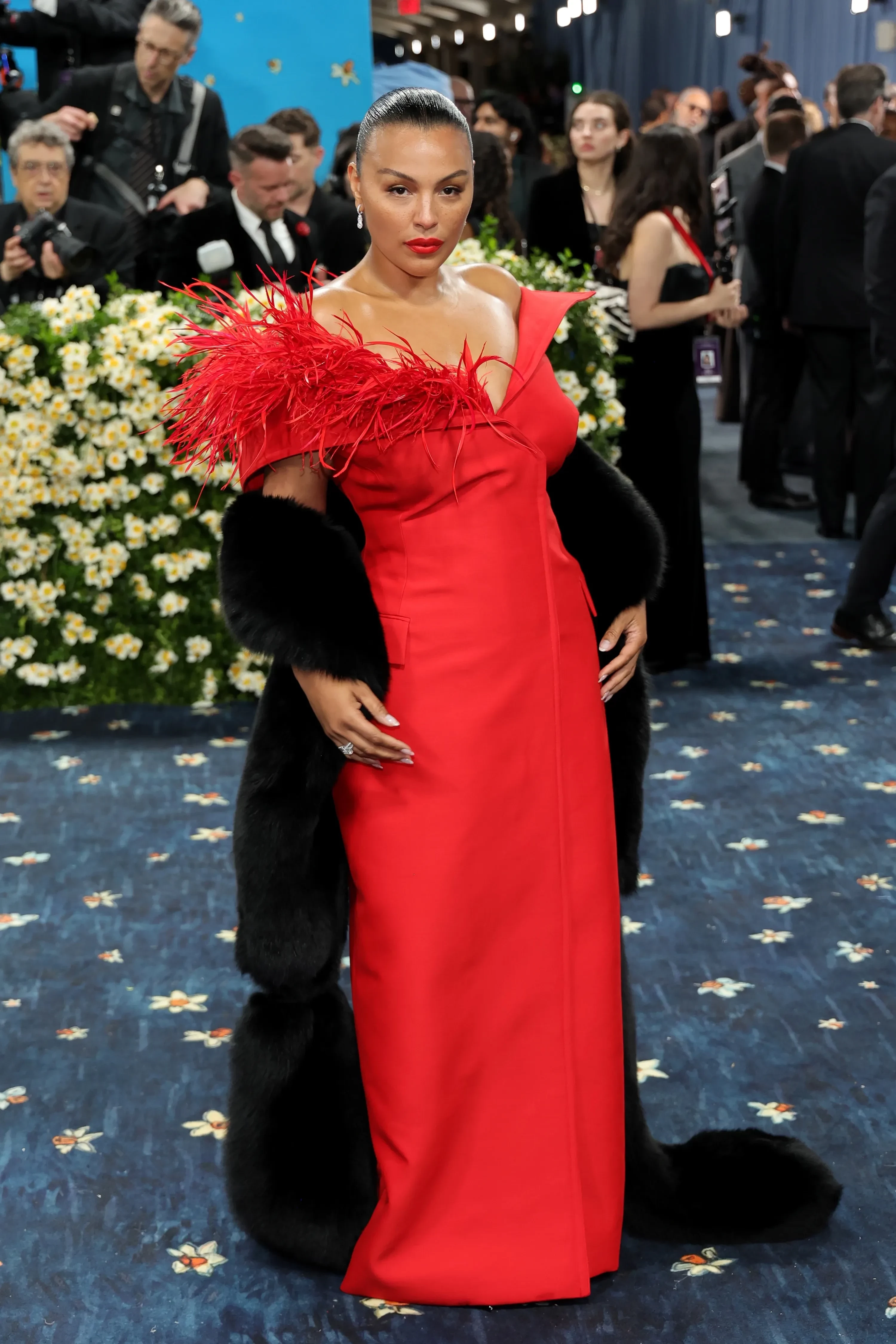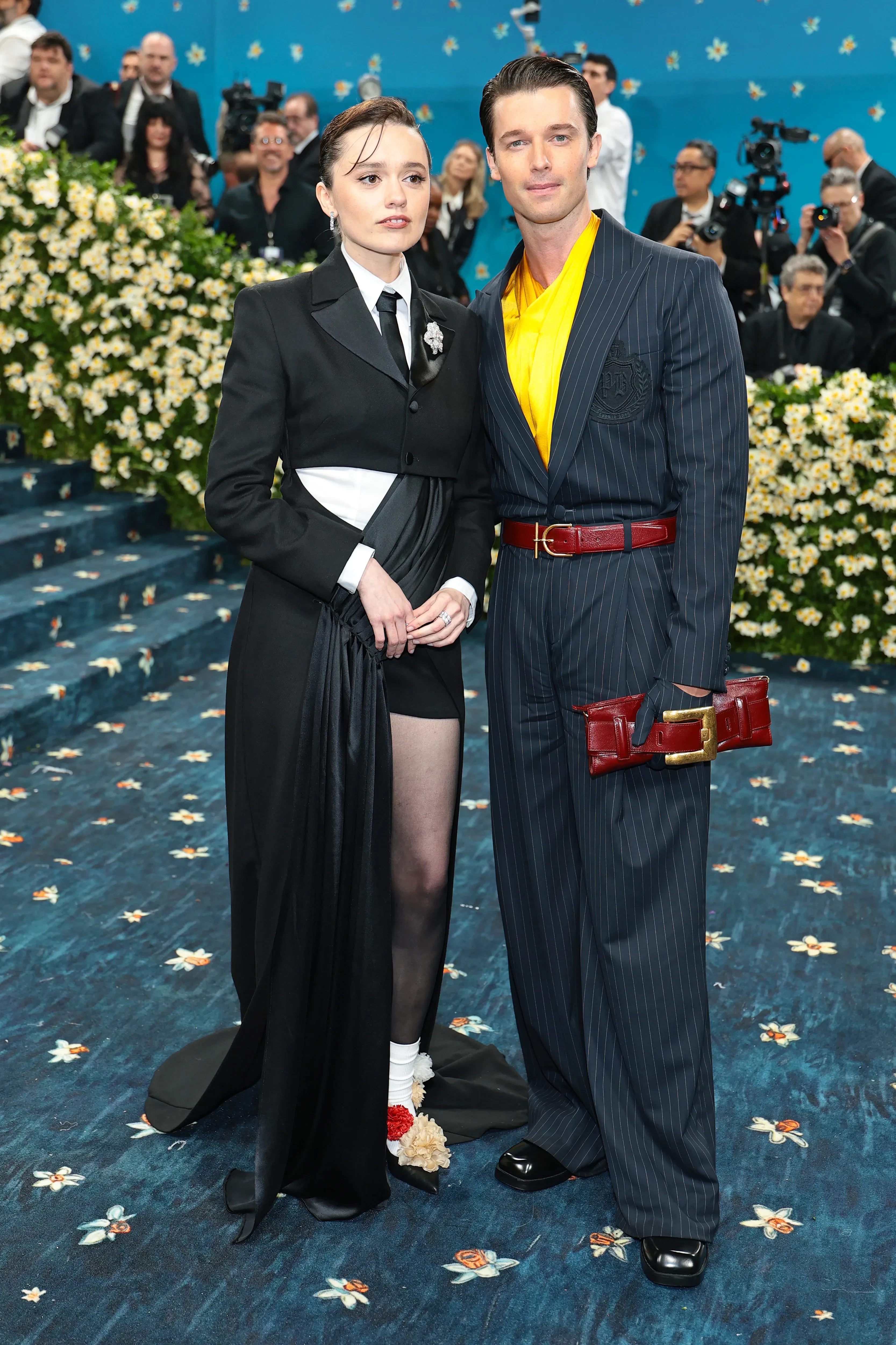 Bad Bunny в PradaАктриса Зои Салдана надела чёрно-белый образ Thom Browne, а Лана Дель Рей пришла не в компании мужа, как надеялись фанаты, а с другом, креативным директором Valentino Алессандро Микеле, и в платье его творчества с кружевом на спине и огромным пером. Ещё один гармоничный парный лук показали звёзды "Белого лотоса" Эми Лу Вуд и Патрик Шварценеггер. Блогерша Эмма Чемберлен позировала в стиле "офисной сирены" в Courreges, а Палома Эльсессер добавила красок этому вечеру в платье Ferragamo с перьями с меховой накидкой.