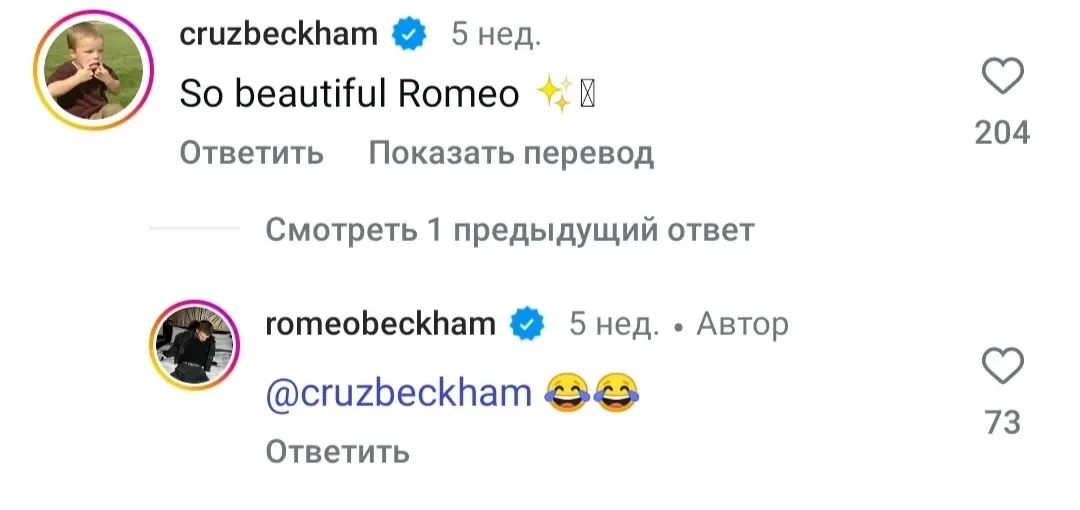 Недавно Ромео опубликовал в инстаграме* слайд-шоу из фотографий, и Круз оставил под постом комментарий: "Так красиво, Ромео!". Ранее Никола Пельтц точно так же прокомментировала фотографии бывшей девушки Ромео, Миа Реган. Поклонники семейства Бекхэм посчитали, что Круз намеренно затроллил Николу, и позже уверились в своей правоте, когда Ромео ответил брату смеющимися эмодзи.