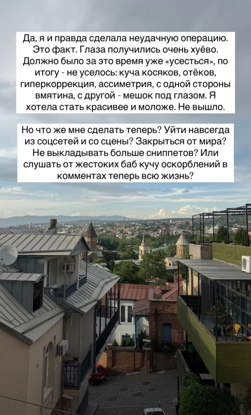 Рита Дакота"Да, я и правда сделала неудачную операцию. Это факт. Глаза получились очень ***** (плохо. — Прим. ред.). Должно было за это время уже "усестья", но по итогу не уселось: куча косяков, отеков, гиперкоррекция, асимметрия, с одной стороны вмятина, с другой — мешок под глазом. Я хотела стать красивее и моложе. Не вышло", — написала Рита.