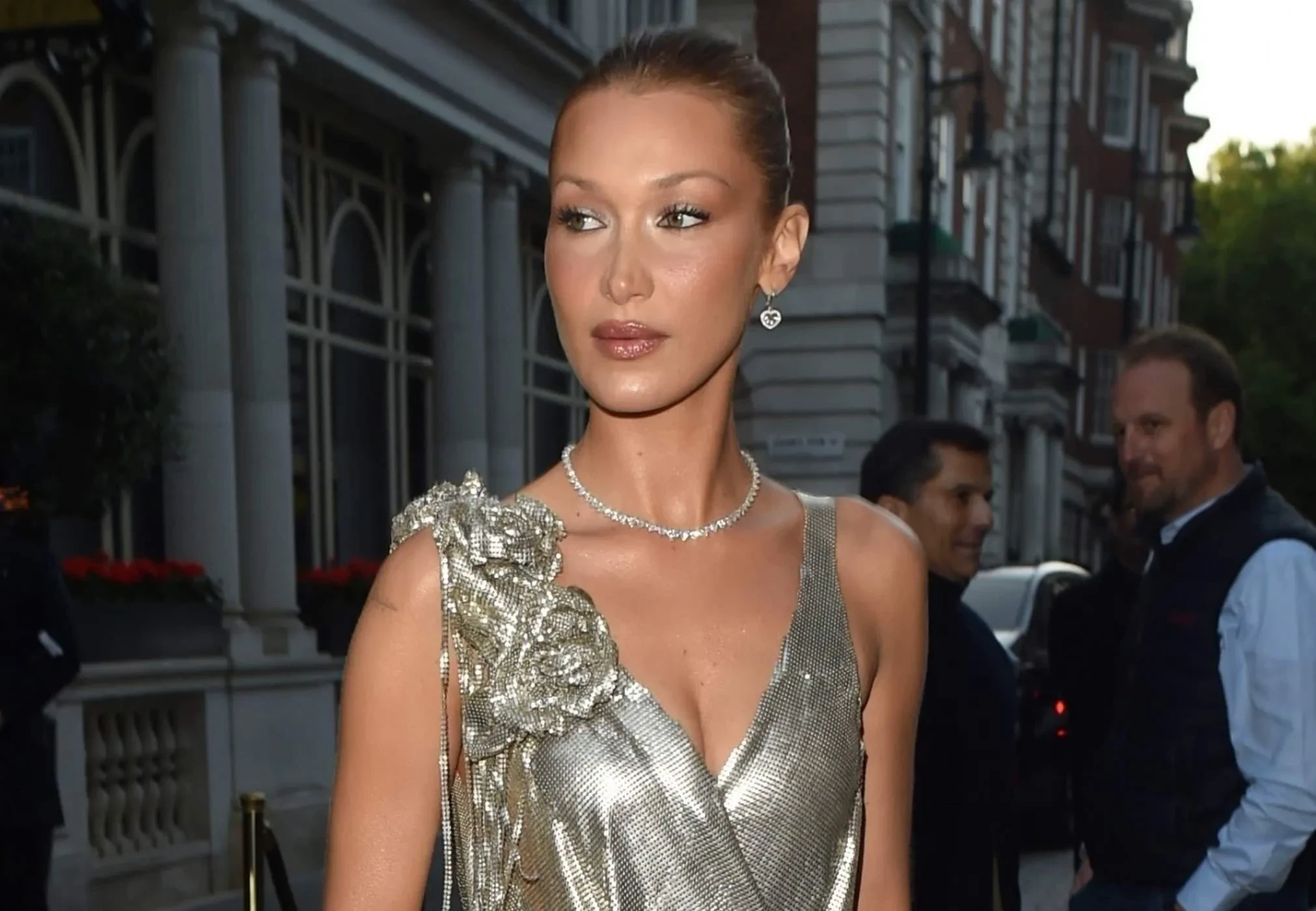 28-летняя Белла Хадид посетила мероприятие своего бренда Orebella в Лондоне в необычном образе — она надела серебристое платье авторства Джона Гальяно, в котором Милла Йовович появилась на каннской премьере фильма “Пятый элемент” в 1997 году.