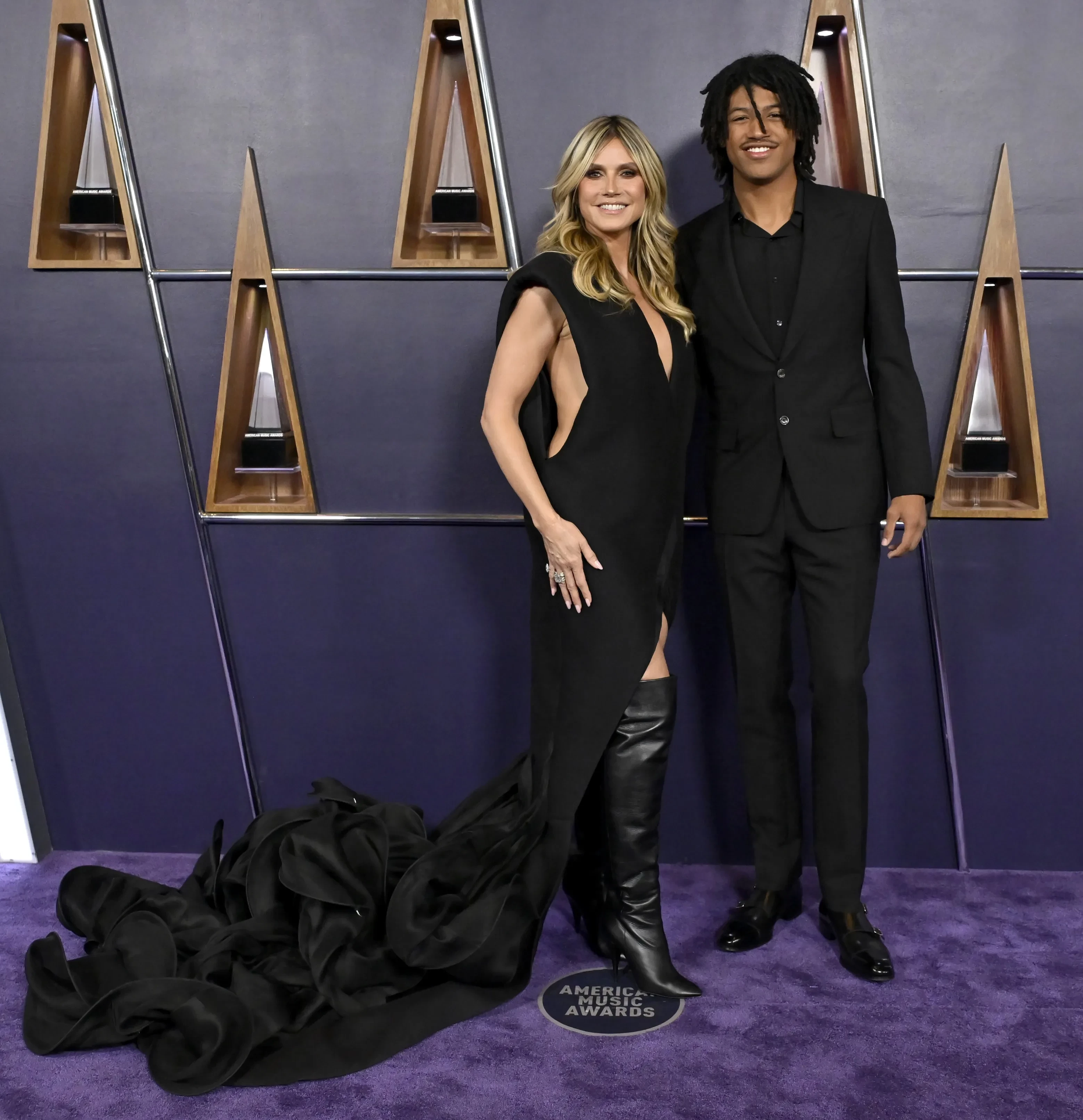Хайди Клум с сыном ГенриХайди Клум с сыном Генри55-летняя Дженнифер Лопес за время церемонии вручения наград премии сменила восемь образов. На дорожке она появилась в платье песочного оттенка с разрезами, а на сцене примерила платье с накидкой с вышивкой Miss Sohee, телесный комбинезон с кристаллами Swarovski и абстрактными чёрными фигурами, а также топ в форме креста с юбкой с бахромой. Кульминацией вечера стал поцелуй певицы, которая не так давно развелась с Беном Аффлеком, с одним из танцоров.