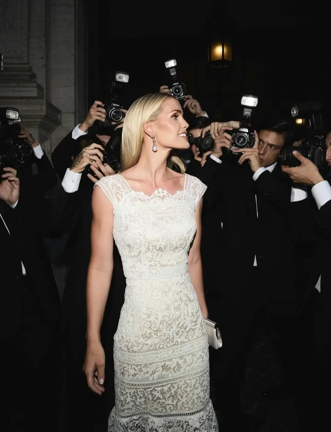 Появление Китти на вечеринке вышло эффектным: она приехала на винтажном жёлтом "фиате". В своих соцсетях Спенсер продемонстрировала свой образ в тот вечер: белое кружевное платье миди, в тон к которому она подобрала туфли и клатч.