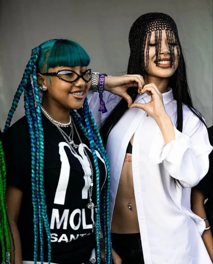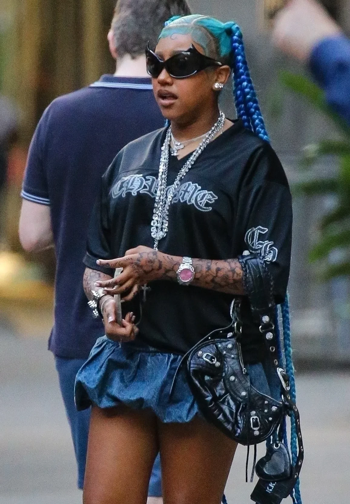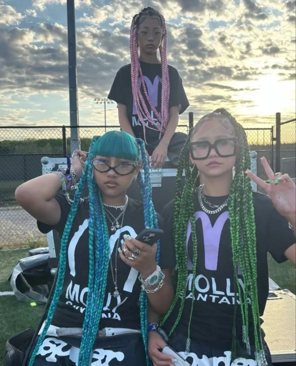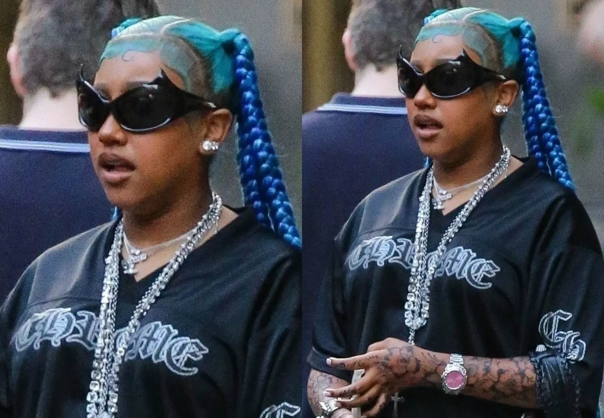 Старшую дочь Ким Кардашьян и Канье Уэста, 12-летнюю Норт, засняли в Нью-Йорке в ярком образе: футболку с принтом и мини-юбку девочка дополнила кроссовками Rick Owens, очками Balenciaga и крупными украшениями, но главным акцентом образа стали длинные синие косы и татуировки, очевидно переводные, которыми были забиты все руки.