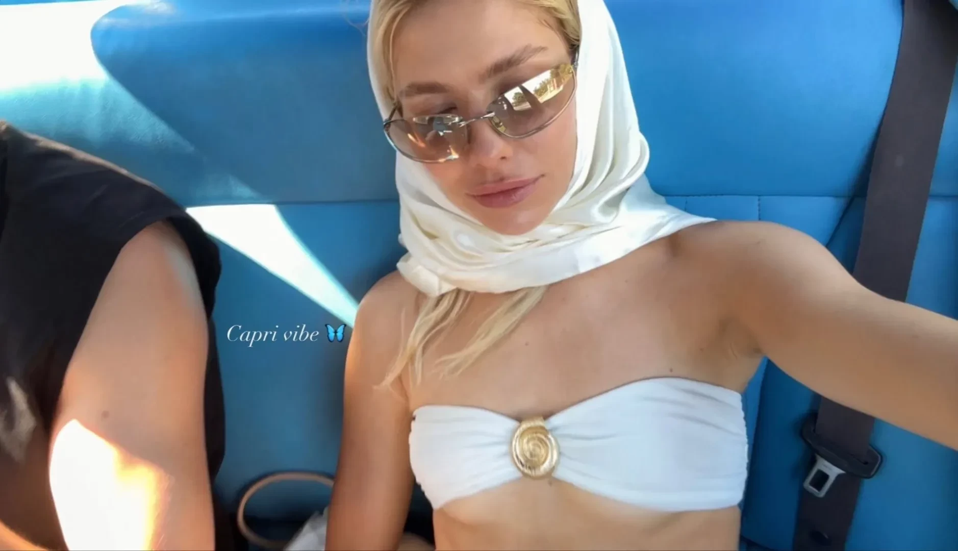 В своих соцсетях влюблённые поделились фотографиями с отдыха. На одном из кадров можно увидеть Елену в белом купальнике, солнцезащитных очках и платке на голове, сидящую в машине рядом с Тарасом. “Вайбы Капри”, — подписала снимок модель.
