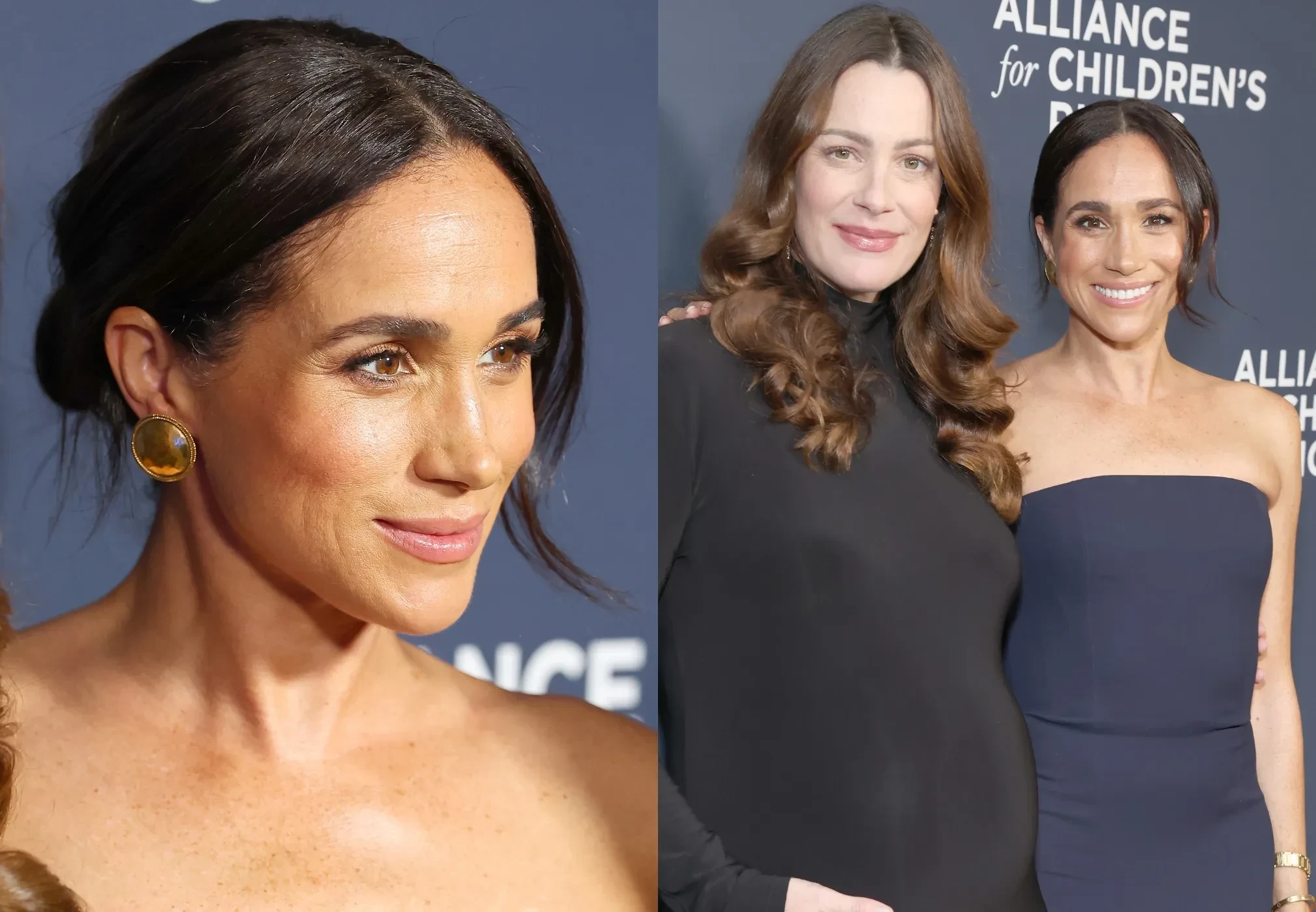 44-летняя супруга принца Гарри позировала в платье-бандо тёмно-синего цвета и золотых серьгах рядом с беременной подругой (несколько лет назад она потеряла девятилетнего сына).