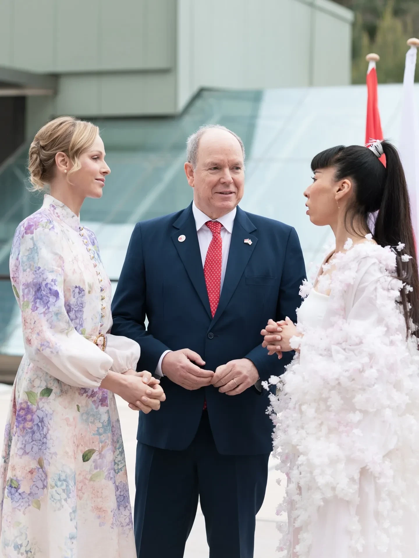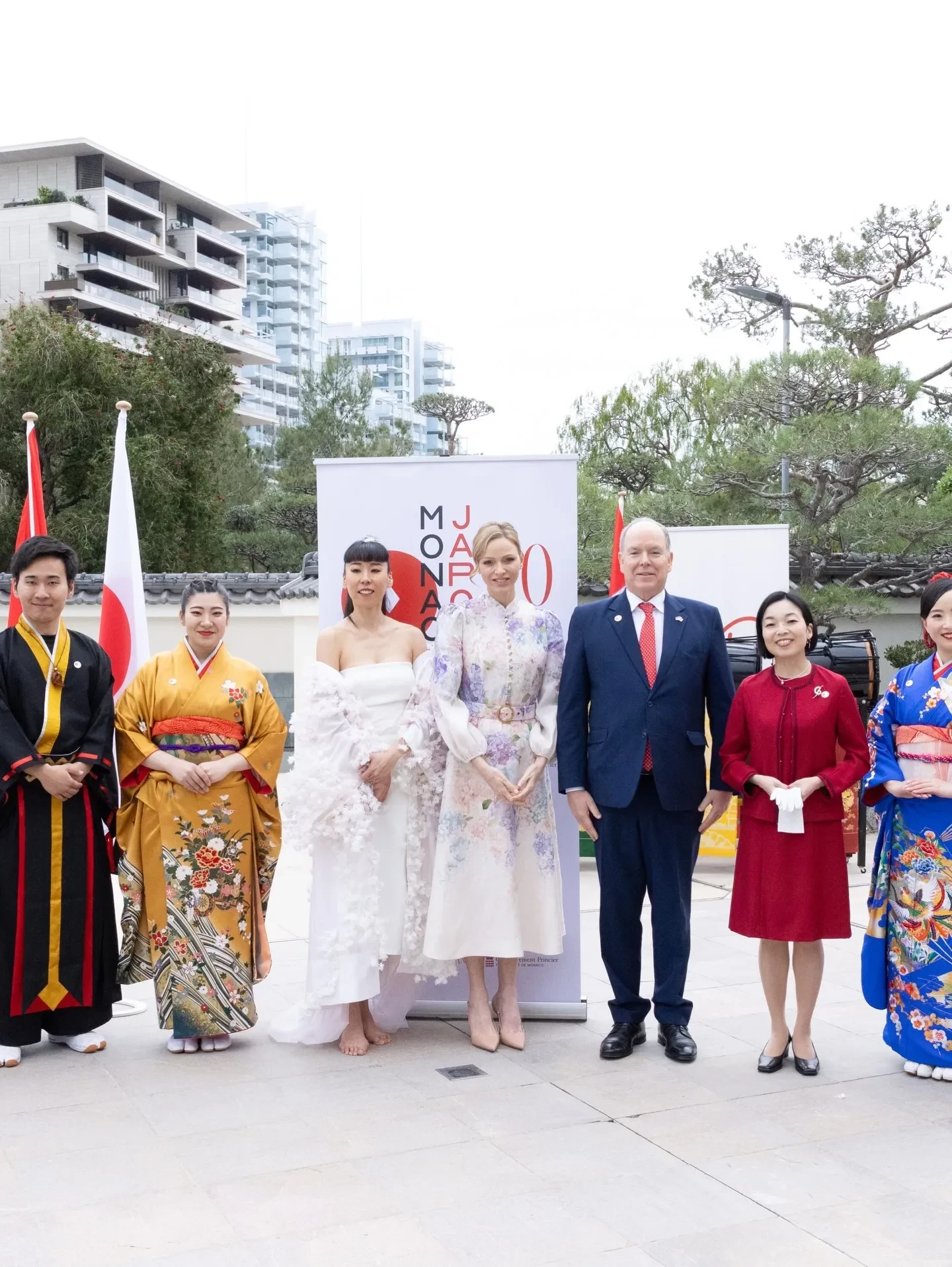 Сначала пара отправилась на площадку рядом с Форумом Гримальди, где в сопровождении японской принцессы Акико Микасы дала старт "Японии в Монако" — мероприятию, посвящённому 20-летию дипломатических отношений между княжеством и Японией. 48-летняя Шарлен появилась на публике в светлом платье Zimmermann с цветочным принтом и воротником-стойкой, а 68-летний Альбер был в классическом синем костюме.
