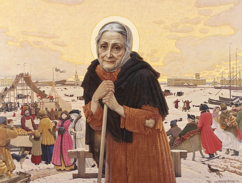 Жители Санкт-Петербурга второй половины XVIII века хорошо знали скиталицу, в любую погоду одетую в жалкое рванье цвета военной формы ее мужа: красную кофту, зеленую юбку. Стоило Ксении появиться на рынке, как всякий рвался ей услужить. Купцы распахивали прилавки: бери — не хочу. Извозчики, издали приметив красно-зеленые лохмотья, гнали лошадей, упрашивая блаженную проехаться с ними хоть пару шагов. Народ знал: блаженная не возьмет себе ни одежду, ни обувь, какие бы ветра или лютый мороз ни студили столицу. Себе не возьмет ничего, ей ничего и не нужно — входя в дом,