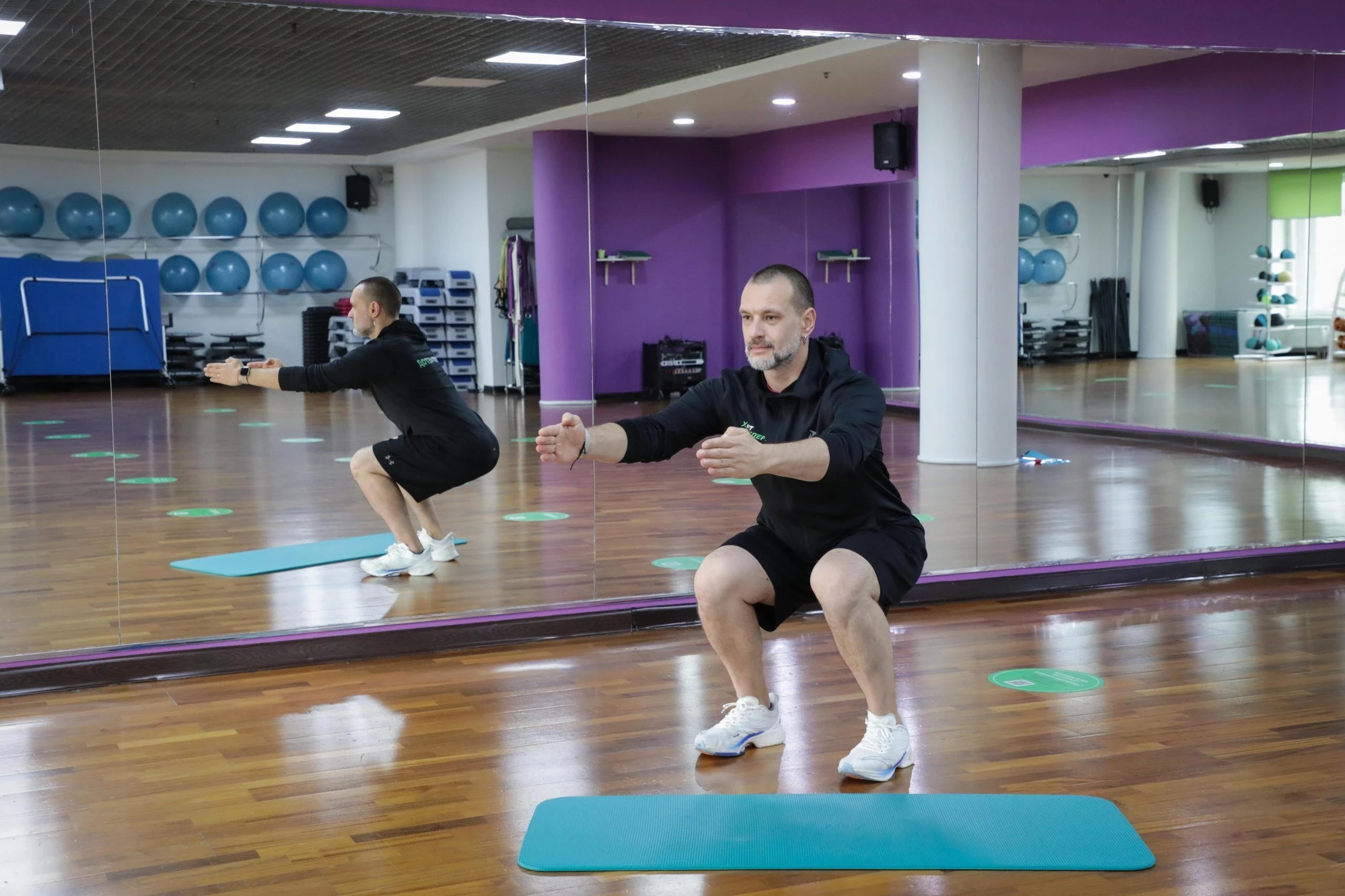 - Опускайтесь в приседание, контролируя движение, и доводите бедра до горизонтального положения. Важно удерживать вес на пятках.