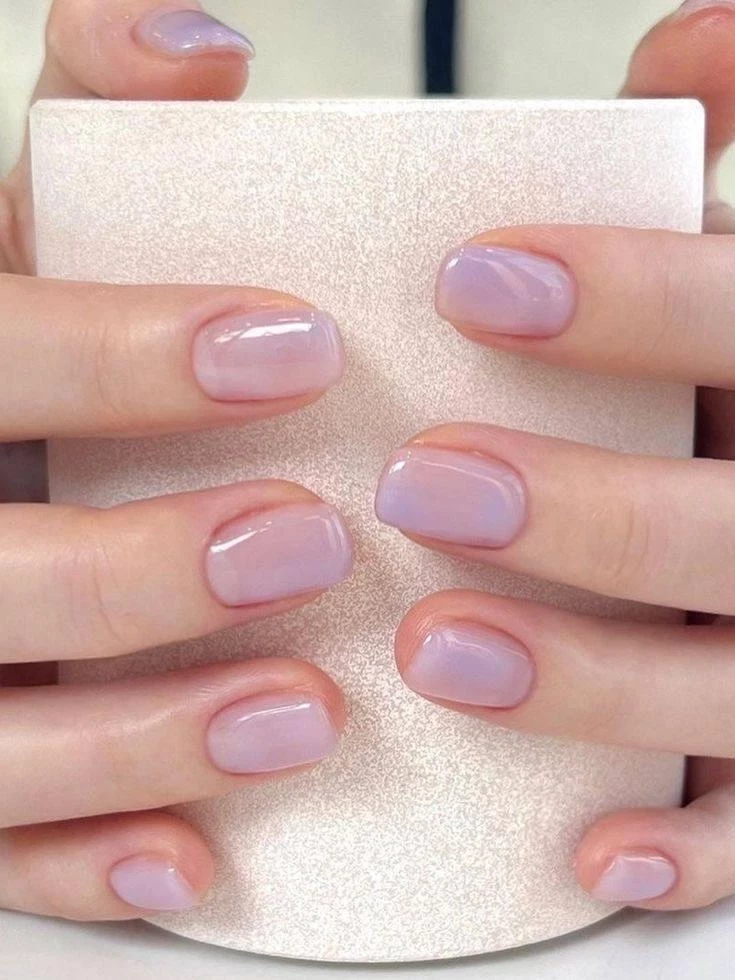 Стилисты советуют остановиться на полупрозрачном светло-лавандовом лаке. Он создает мягкий эффект, напоминая о весенних бутонах сирени. Допускаются и эксперименты: от плотного однотона до нежного аэрографического напыления или покрытия с мелким шиммером, добавляющим едва заметное сияние.