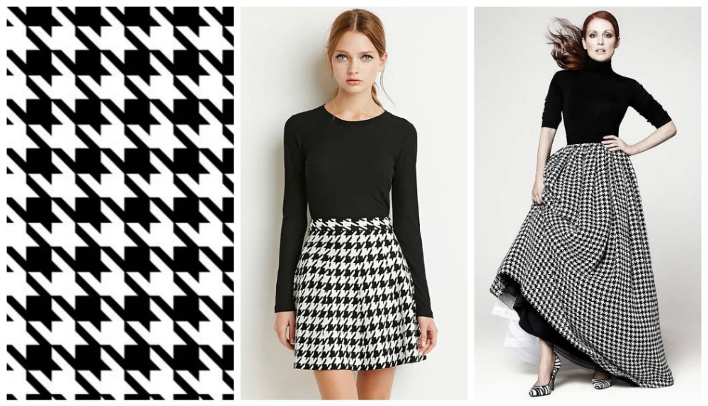 Этот элегантный узор представляет собой деформированные клетки с вытянутыми углами. Во французском языке он называется pied-de-poule («куриная лапка»), а более крупная его вариация получила название «собачий клык». В XIX веке рисунок стал любимым среди британской аристократии, а в 1930-е Коко Шанель сделала его культовым, введя в свои твидовые коллекции.