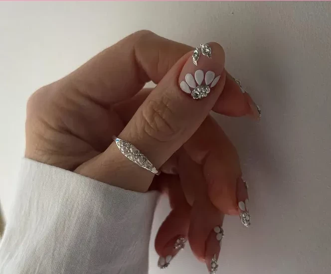 Весна — время цветения, а значит, и маникюр должен соответствовать настроению! Этот дизайн сочетает в себе нежные цветочные мотивы с сиянием мелких жемчужин и страз, напоминая роскошные ювелирные украшения.