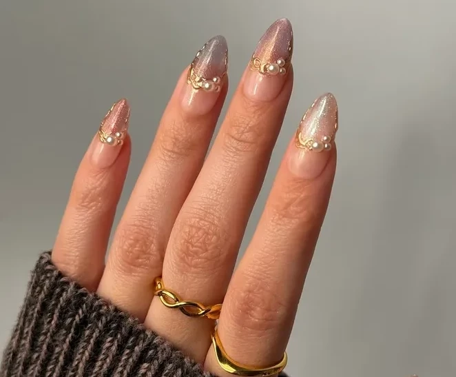Идеальный вариант для тех, кто не хочет отказываться от элегантности и сдержанности. Пастельные переливы на кончиках ногтей, дополненные тонкой золотой каймой и жемчужными акцентами, придают рукам аристократичную изысканность.
