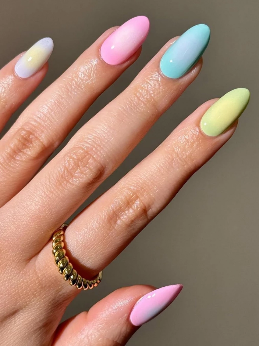 Сочетание мягких пастельных оттенков и сияющих кругов по центру ногтя (эффект ауры) создаёт на ногтях настоящий калейдоскоп изобилия. Лиловый, небесно-голубой, розовый и салатовый — всё это символы лёгкости, удачи и весенней свежести.