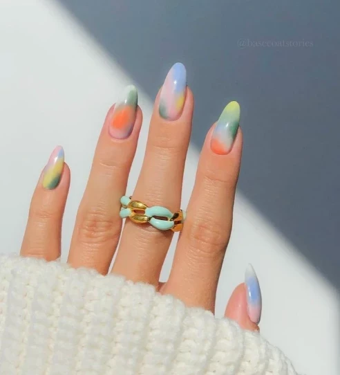 Главное — полупрозрачность и воздушность цвета. Особенно популярны сочетания мятного с розовым или лавандового с персиковым. Такая гамма красиво подчёркивает миндалевидную форму ногтей и отлично смотрится на средней длине.