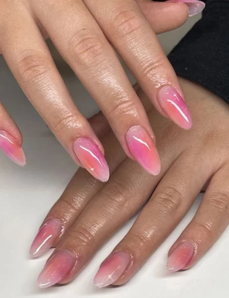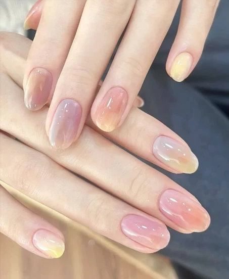 Желейный маникюр с аурой — свежий тренд из Кореи, который завоёвывает сердца. Эффект полупрозрачного покрытия создаёт впечатление тонкого слоя цветного льда или кристалла на ногтях. Особенно красиво смотрятся оттенки розового, лавандового и голубого.