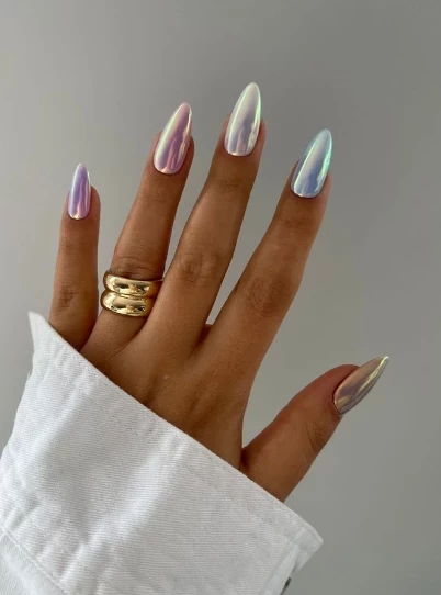 Аура с перламутровым финишем — это чистая магия. Цвета будто оживают на ногтях, меняясь при каждом движении руки. Такой эффект напоминает драгоценный опал и добавляет загадочности любому образу.