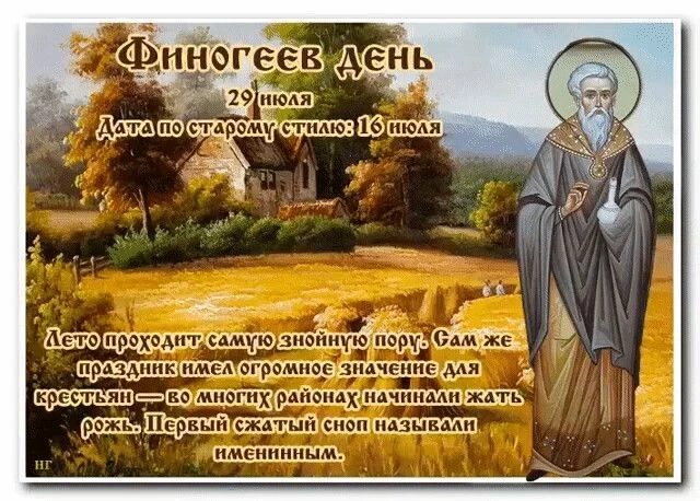 Народный праздник Финогеев день, который в народе чаще называют просто Финоген, традиционно связан с периодом жатвы — одним из самых важных этапов в жизни крестьянина. В этот день первый сноп, который называли именинным, торжественно заносили в гумно под песни. Этот сноп нес хозяин, за ним шли работники — символизируя завершение тяжелого труда и начало нового этапа. Именинный сноп хранили и использовали в различных обрядах для защиты и благополучия семьи.