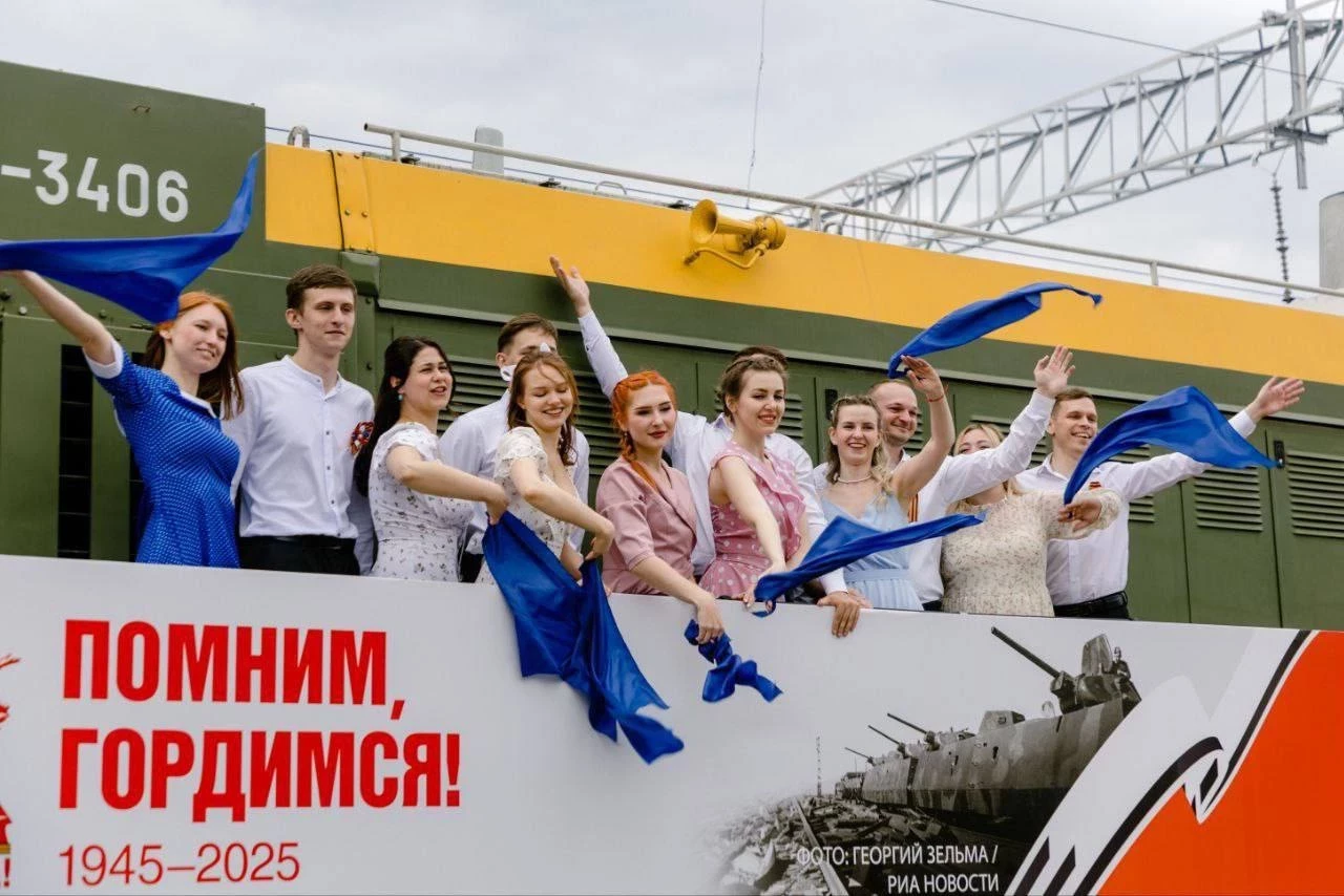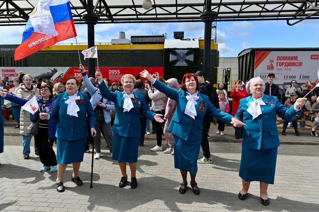 Танцевальные флешмобы с участием местных жителей прошли на вокзалах в дни прибытия в регионы «Поезда Победы» - совместного проекта Юго-Восточной магистрали и Минобороны России, посвященного 80-летию Победы в Великой Отечественной войне.